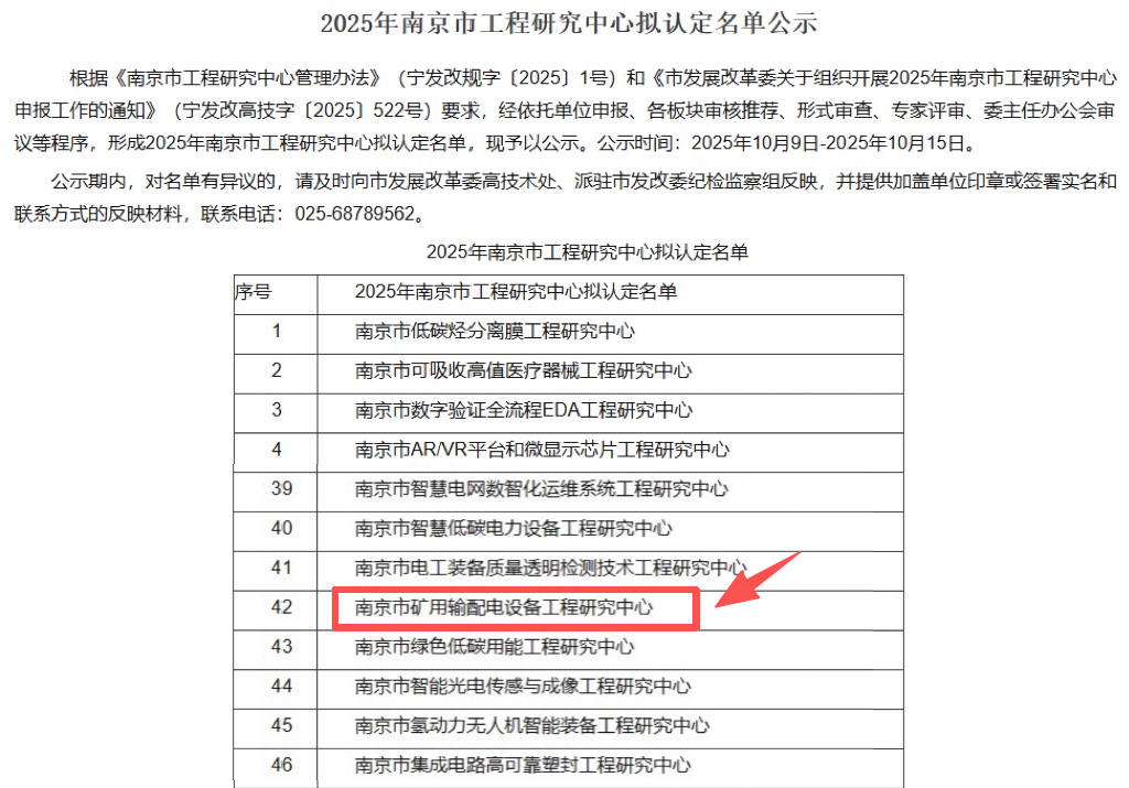 近日,南京市发展和改革委员会公布2025年南京市工程研究中心榜单,中电股份公司矿用输配电设备工程研究中心成功上榜。